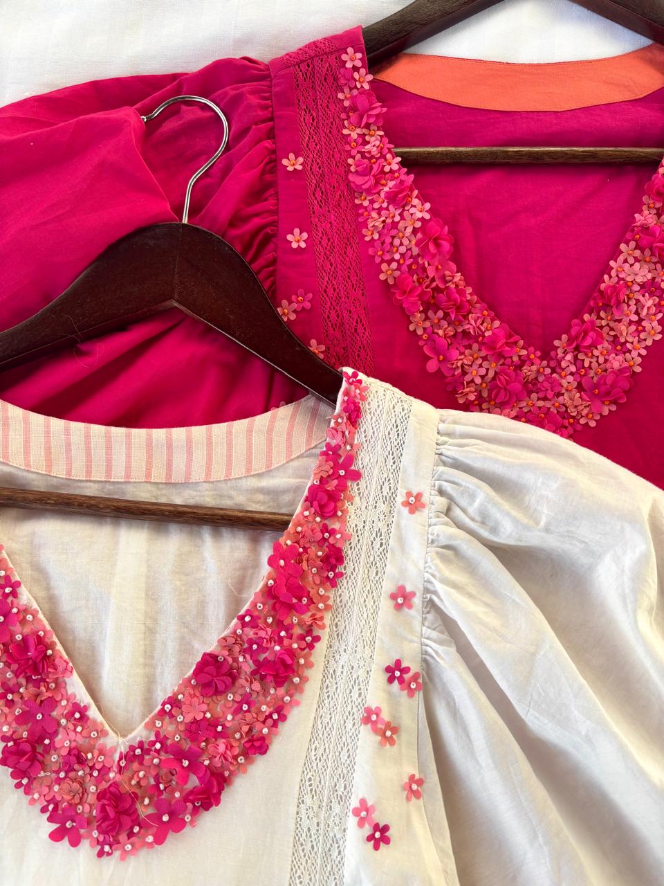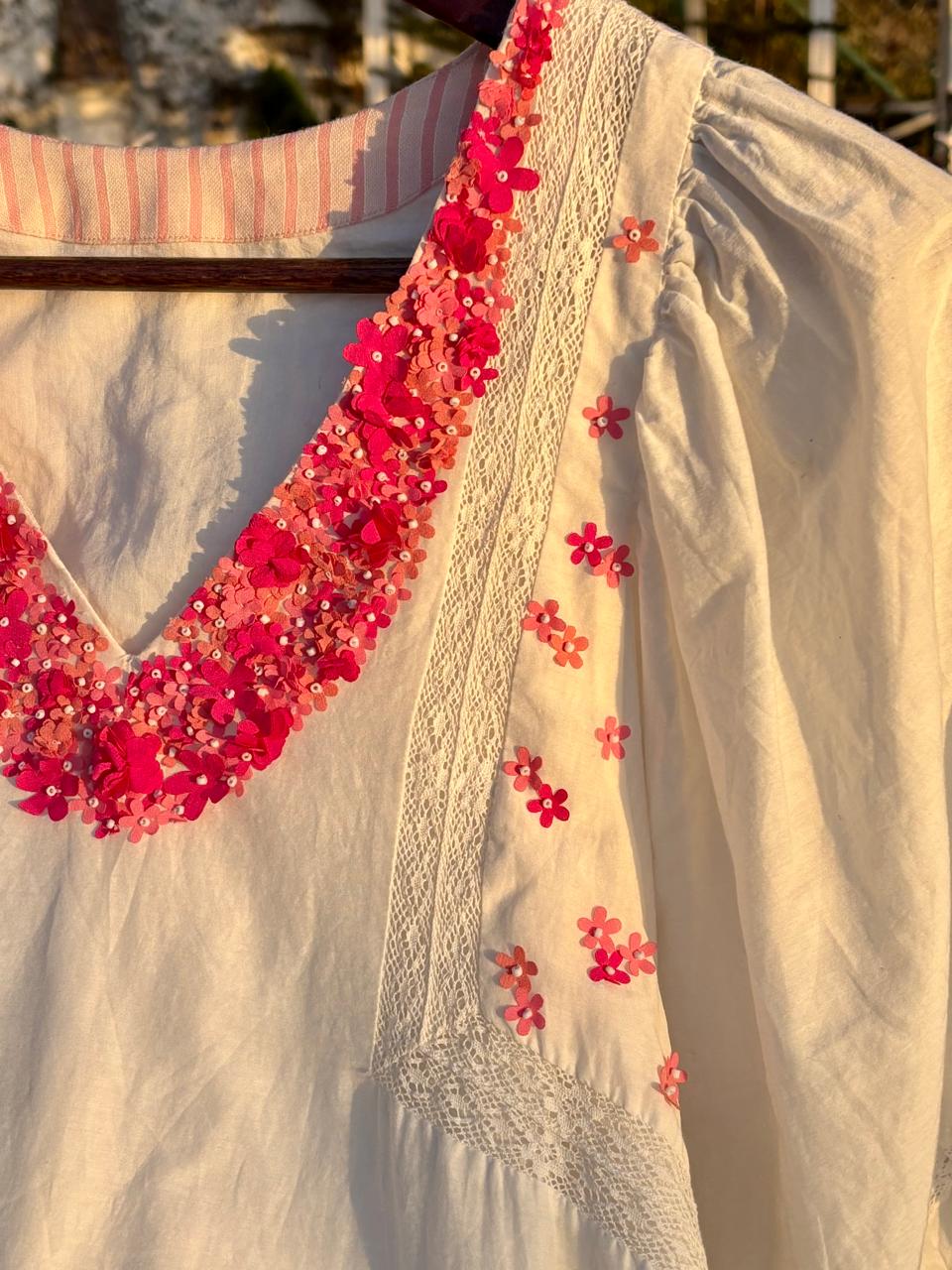 This striking Ecru silk / cotton dress features intricate hand-embroidered 3D flowers blooming along the neckline and bodice. Soft puffed sleeves and delicate lace inserts add elegance and texture. With its flattering knee-length flare and artisanal detailing, it’s a perfect blend of timeless charm and handcrafted luxury. This dress is lined with soft mulmul lining.