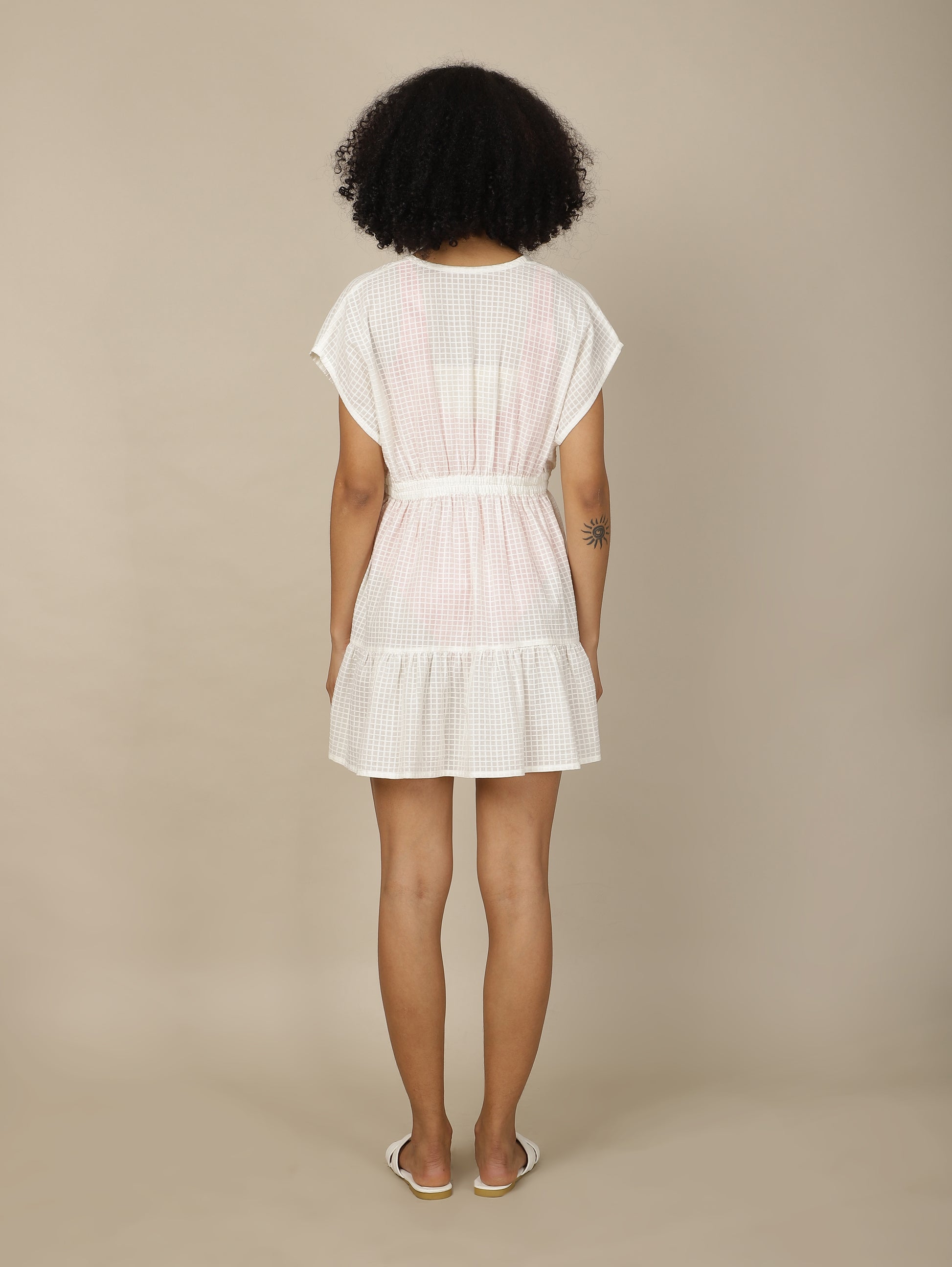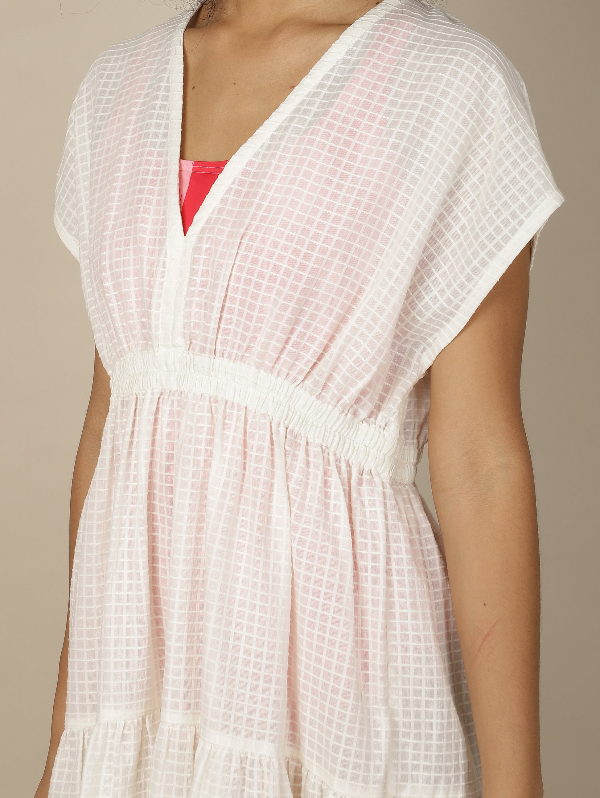 A perfect beach cover up featuring 100% cotton self-textured fabric, with gathers at the waist this is an easy style to put on when going to a pool or beach.