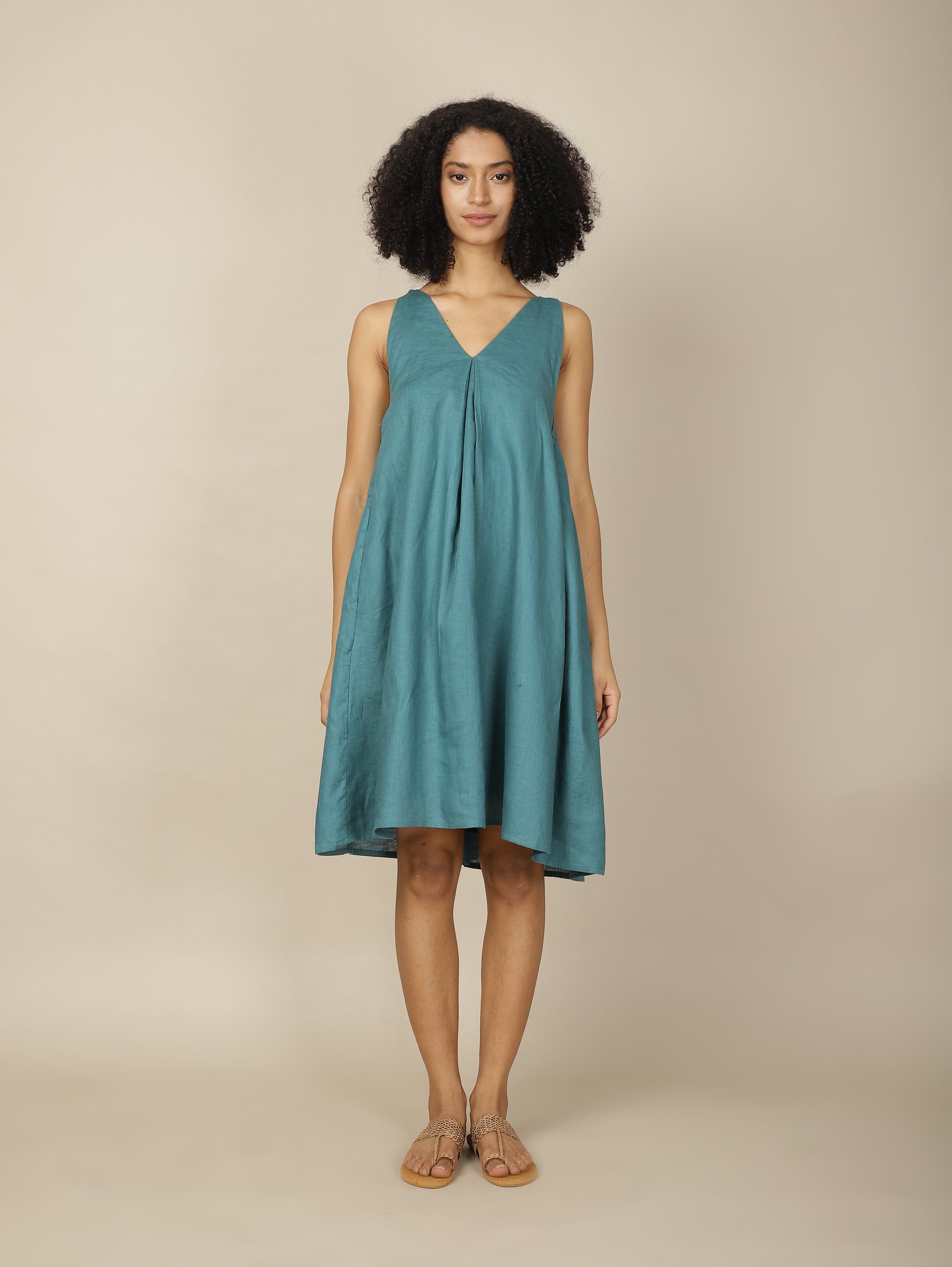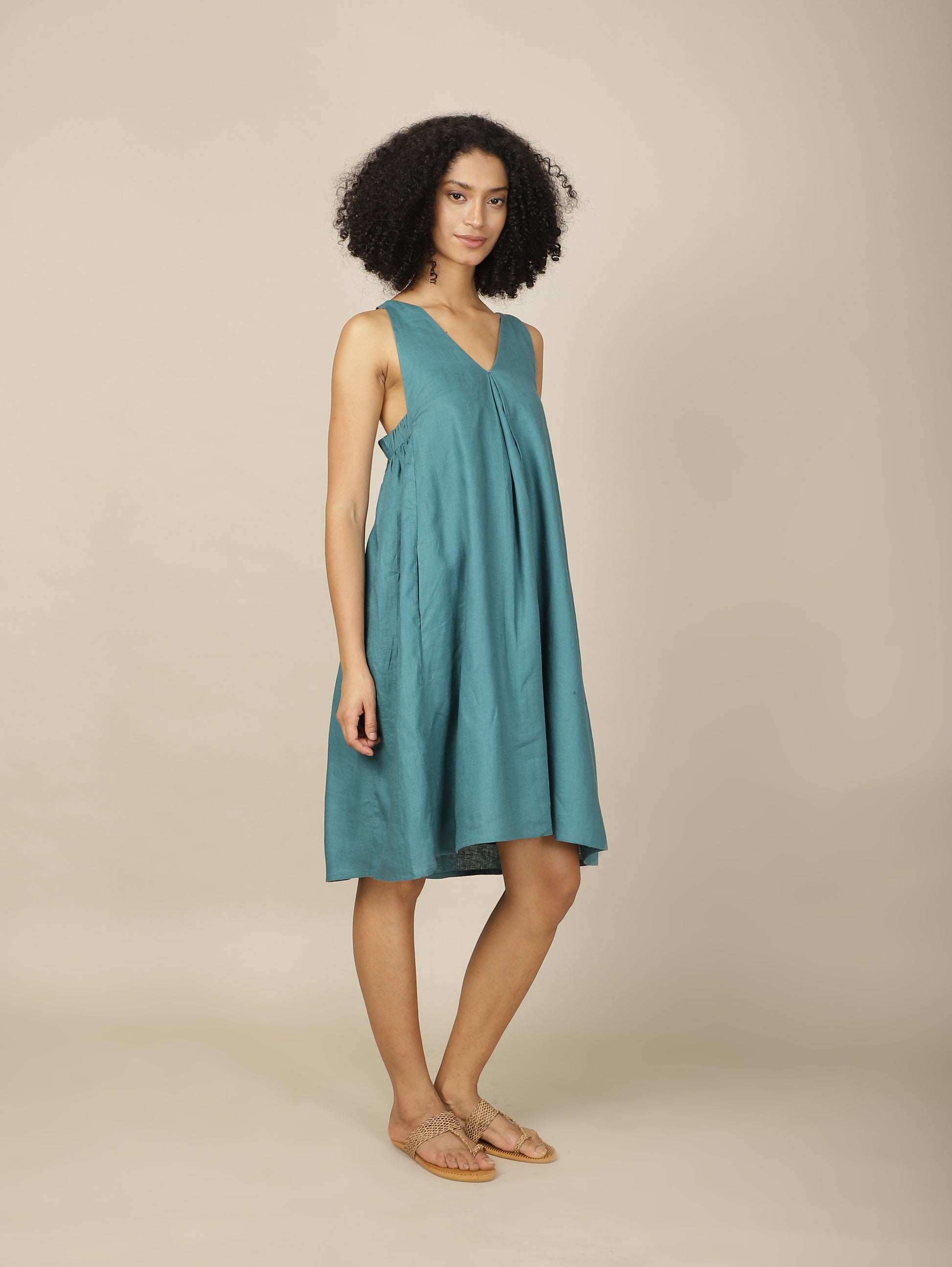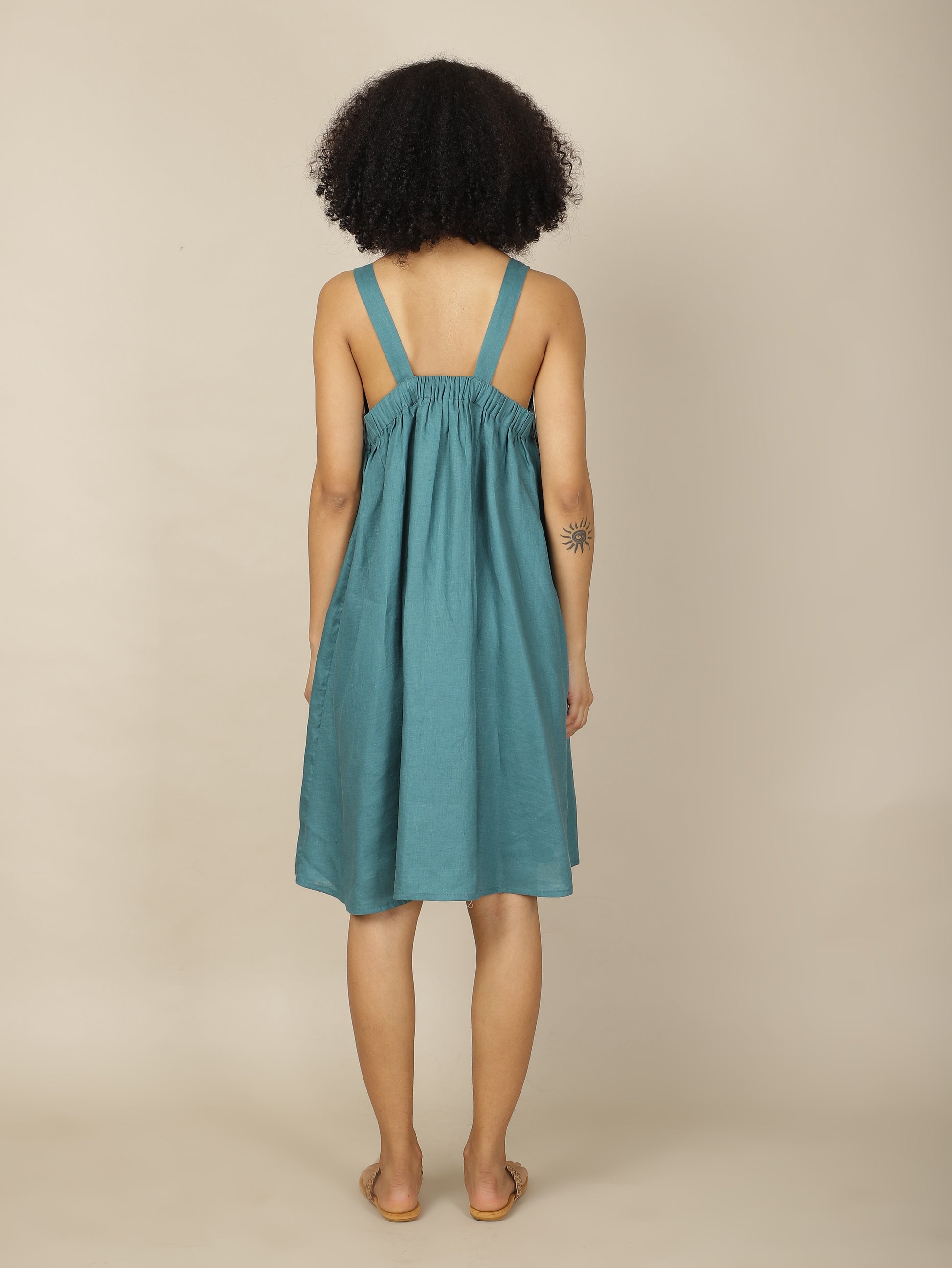 In 100% linen, the Teal Chic Dress is a summer essential, the ultimate easy halter dress to keep you cool throughout the warmest days. Straps frame the back neck, while the subtly smocked back makes it fit well. The body is cut generously and has pockets on both sides.